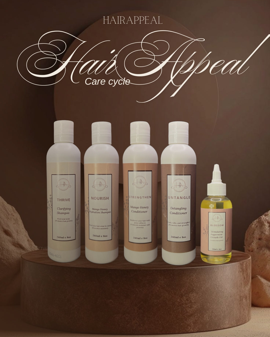 Created by a licensed stylist and textured hair educator, The HairAppeal Care Cycle is a professional grade product system that mirrors the natural rhythms of hair health: detangle, cleanse, hydrate, strengthen, and grow.
