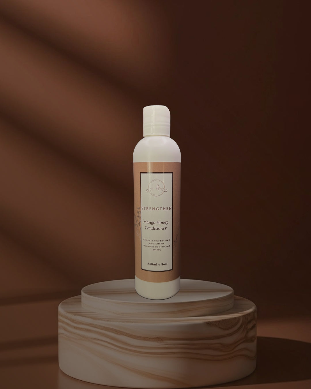 A rich, reparative conditioner packed with mango, honey, and strengthening proteins to rebuild dry, fragile strands while locking in moisture and shine.